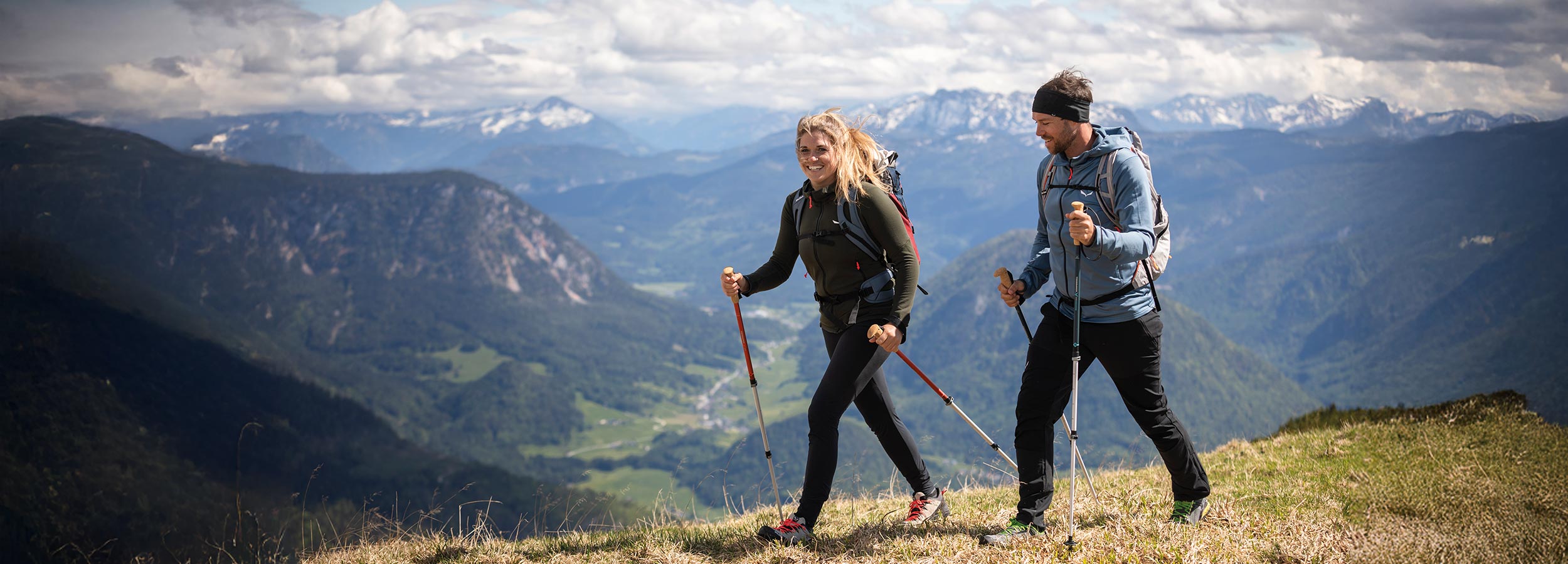 Längenverstellbarer Trekkingstock aus robustem Aluminium mit verlängerter Griffzone und besonders geringem Packmaß.